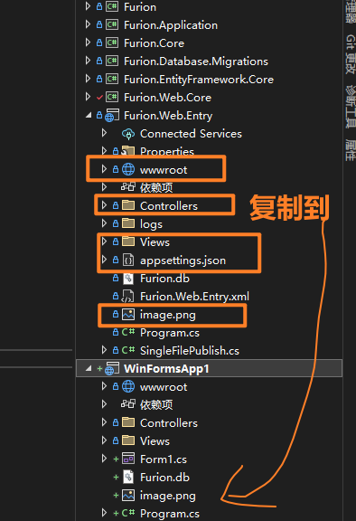 如果有 YourProject.Web.Entry 启动层包含 *.json 文件、Controllers、Views 、wwwroot 目录则拷贝到 WinForm/WPF 中