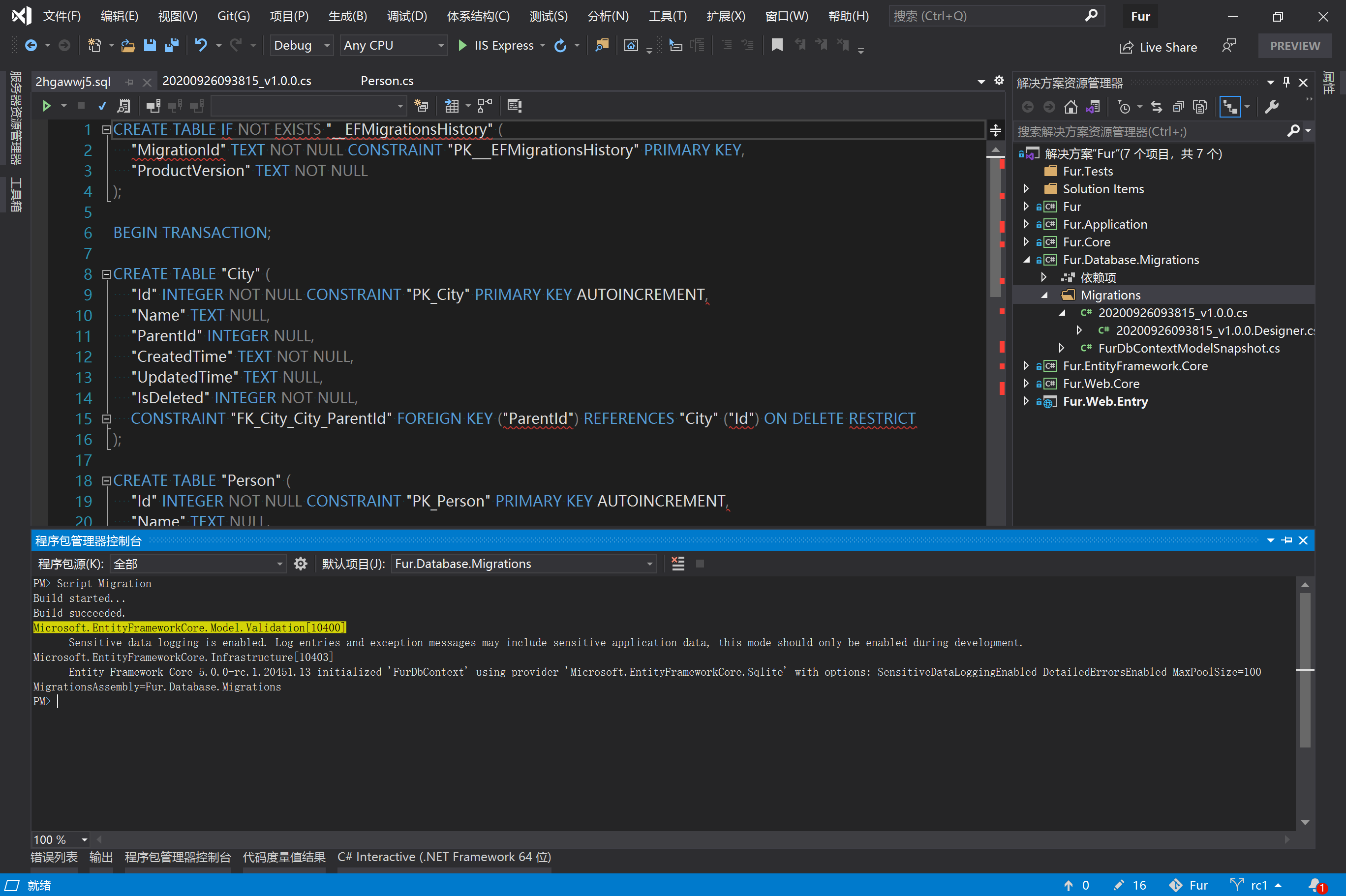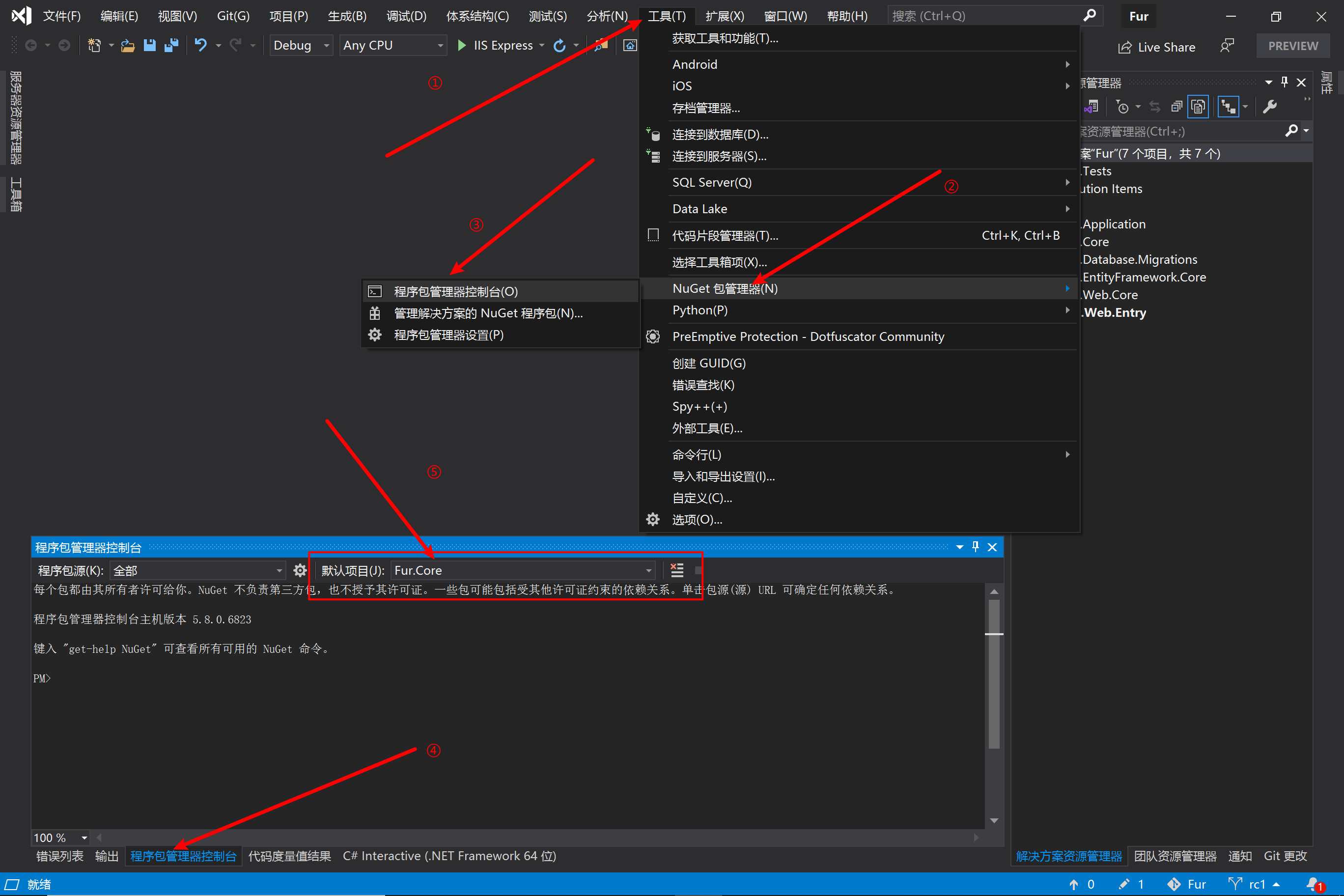 Fur.Web.Entry 层需要安装 Microsoft.EntityFrameworkCore.Tools 包。