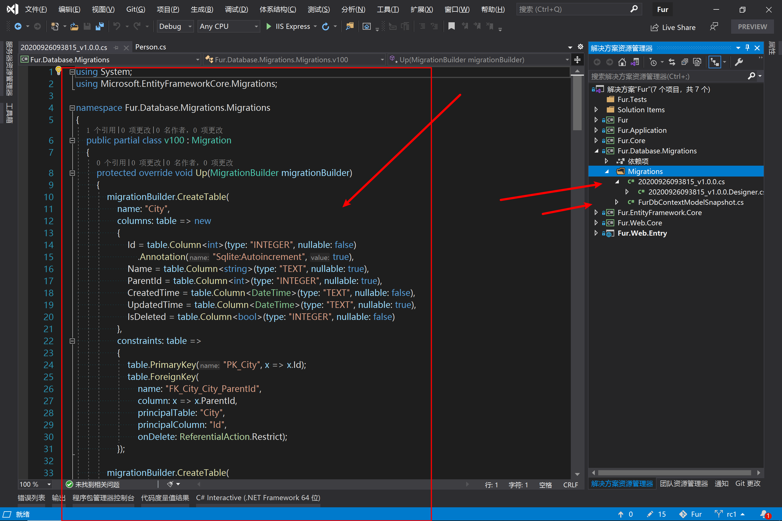 生成成功后,Furion.Database.Migrations 项目下会新增 Migrations 文件夹(如果没有),同时本次的架构生成文件,如:
