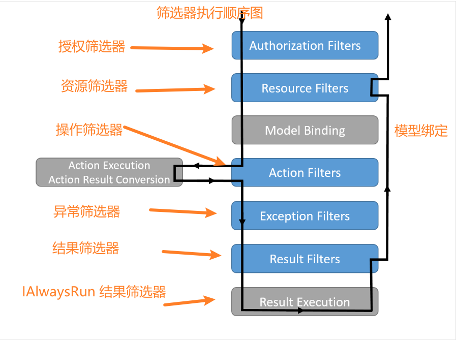 IAuthorizationFilter -> IResourceFilter -> IActionFilter -> IExceptionFilter -> IResultFilter -> IAlwaysRunResultFilter