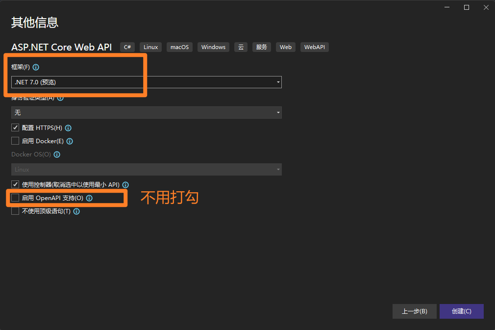 Furion 已经内置了 Swagger 规范化库,所以创建时无需勾选 Enable OpenAPI support 选项。否则提示版本不一致产生冲突。