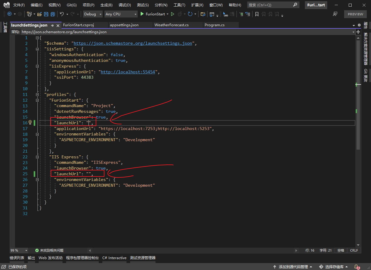 默认情况下,通过 Visual Studio 2022 Preview 创建的项目会自动配置了启动页,如果使用 F5 运行,可能不会自动打开首页,这时候我们只需要配置 launchSettings.jsonlaunchUrl 即可: