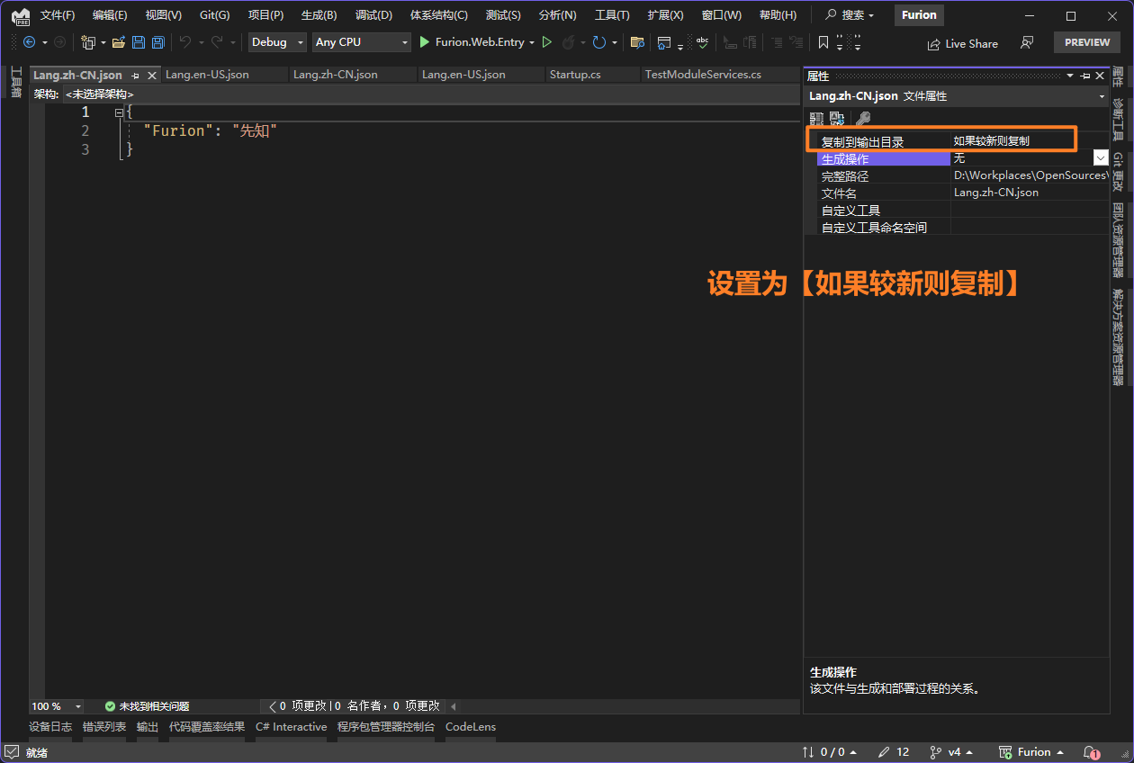 L.Text[文本]:转换文本多语言L.Html[HTML代码, 格式化]:转换Html多语言L.TextOf<T>()[文本]:转换文本多语言,使用该方式那么资源文件需使用完整类型限定名,Furion 4.8.6+ 支持L.HtmlOf<T>()[HTML代码, 格式化]:转换Html多语言,使用该方式那么资源文件需使用完整类型限定名,Furion 4.8.6+ 支持L.SetCulture(区域码):设置当前语言区域,默认在下一次请求有效,第二个参数设置true立即有效L.GetSelectCulture():获取当前的语言区域L.GetCultures():获取系统支持的 多语言列表L.SetCurrentUICulture(区域码):运行时设置当前线程语言区域,立即有效,Furion 4.8.3.10+版本有效L.GetCurrentUICulture(): 获取当前线程 UI 区域性,Furion 4.8.3.10+版本有效L.GetString<T>(u => u.属性): 根据表达式获取翻译,Furion 4.8.3.10+版本有效L.GetString(name, culture): 获取指定的区域翻译,Furion 4.8.8.41+版本有效L.GetDefaultCulture(): 获取本地配置默认语言,Furion 4.8.8.49+版本有效