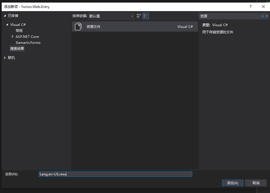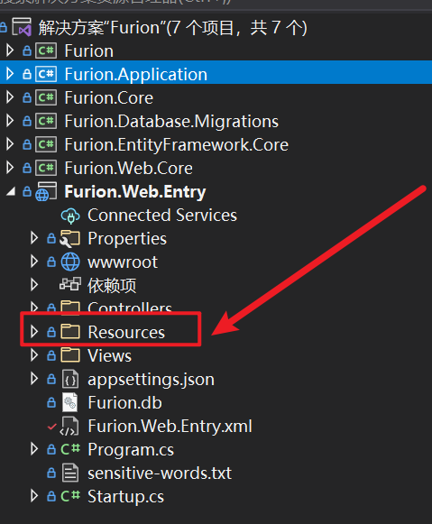 接下来在 Web启动项目层 添加 Resources 文件夹,如图:(可配置放置任意层,见配置 AssemblyName)