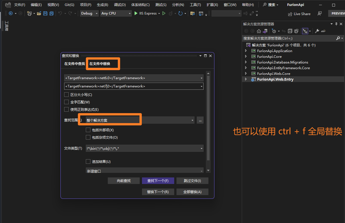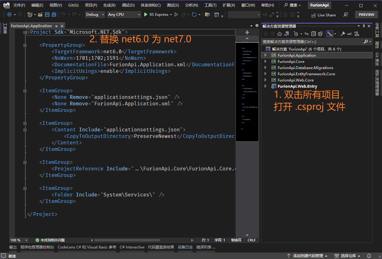 编辑解决方案所有项目的 .csproj 文件,并替换 <TargetFramework>net6.0</TargetFramework><TargetFramework>net7.0</TargetFramework>,如:
