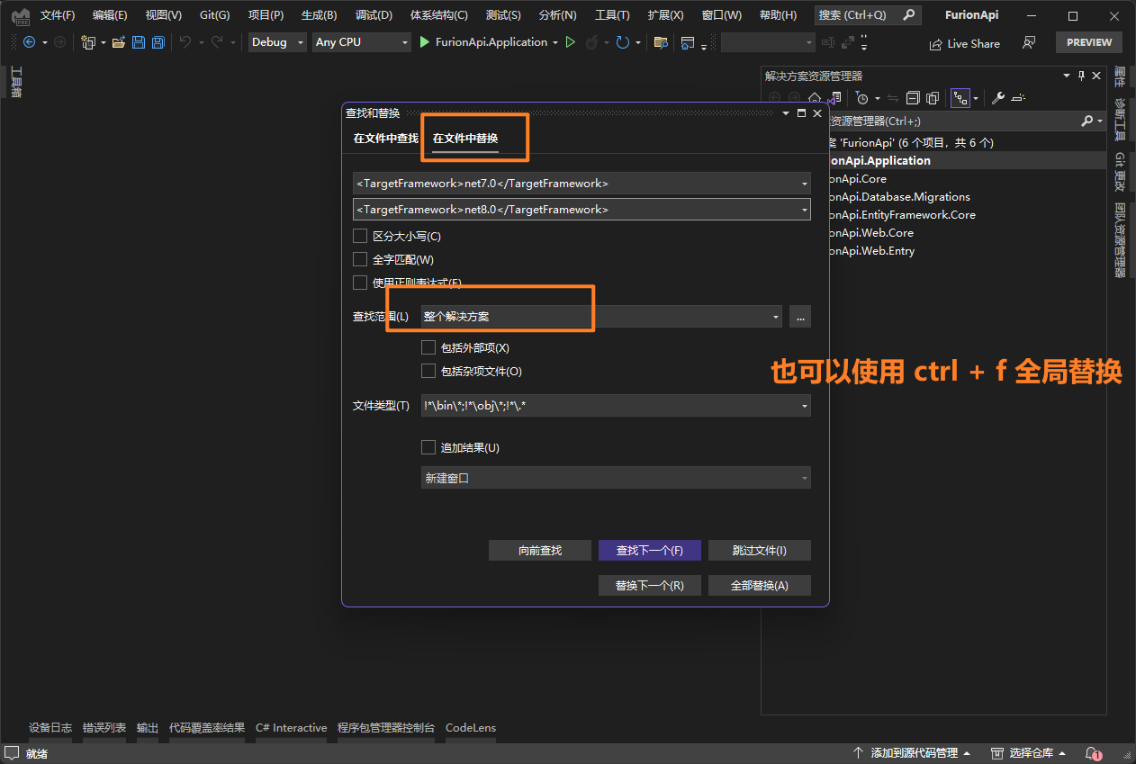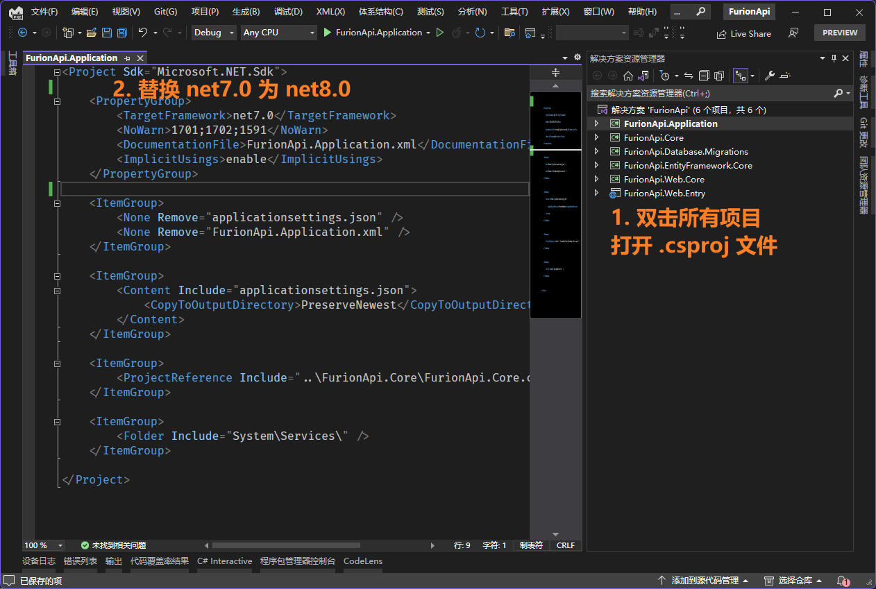 编辑解决方案所有项目的 .csproj 文件,并替换 <TargetFramework>net7.0</TargetFramework> 为 <TargetFramework>net8.0</TargetFramework>,如: