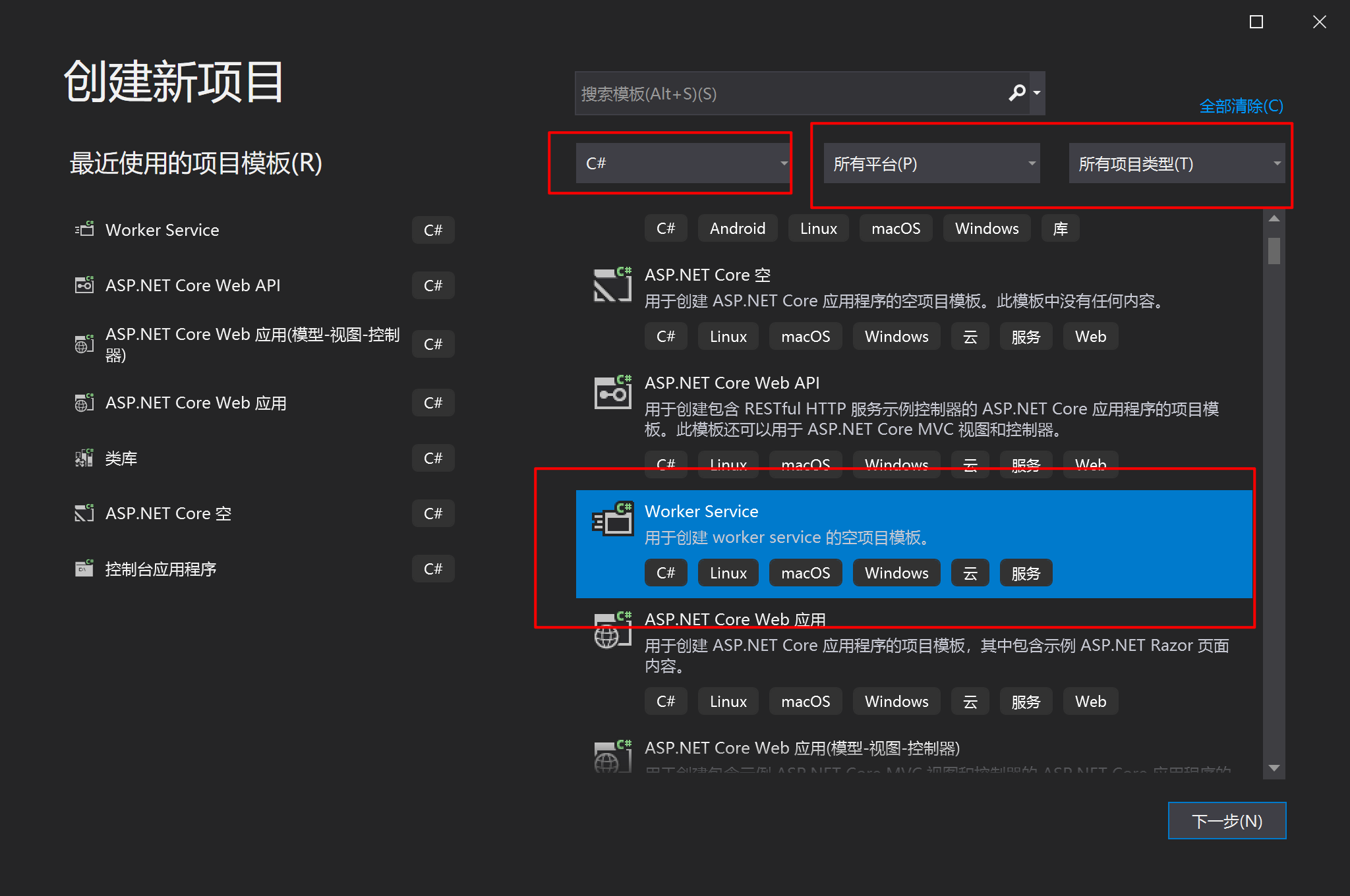 通过 Visual Studio 2019 提供的 Worker Service 可直接创建。如图: