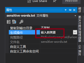 在 Web 启动层项目中创建 sensitive-words.txt 文件,确保采 用 UTF-8 编码格式(Furion 4.8.6.7+ 支持 UTF8 BOM 编码格式) 且设置为嵌入式资源!
