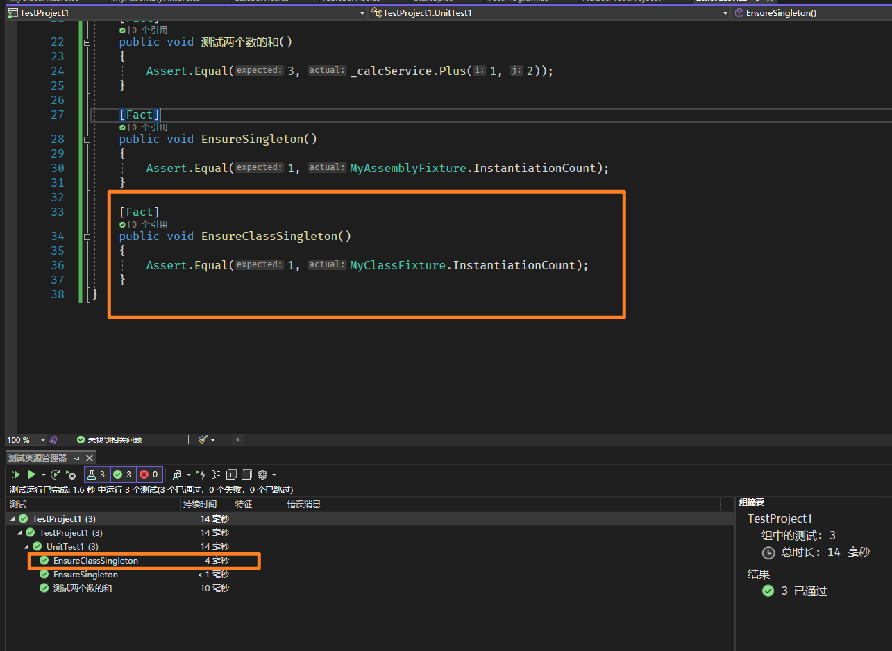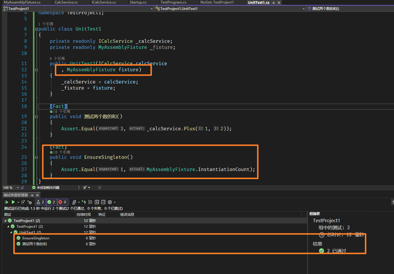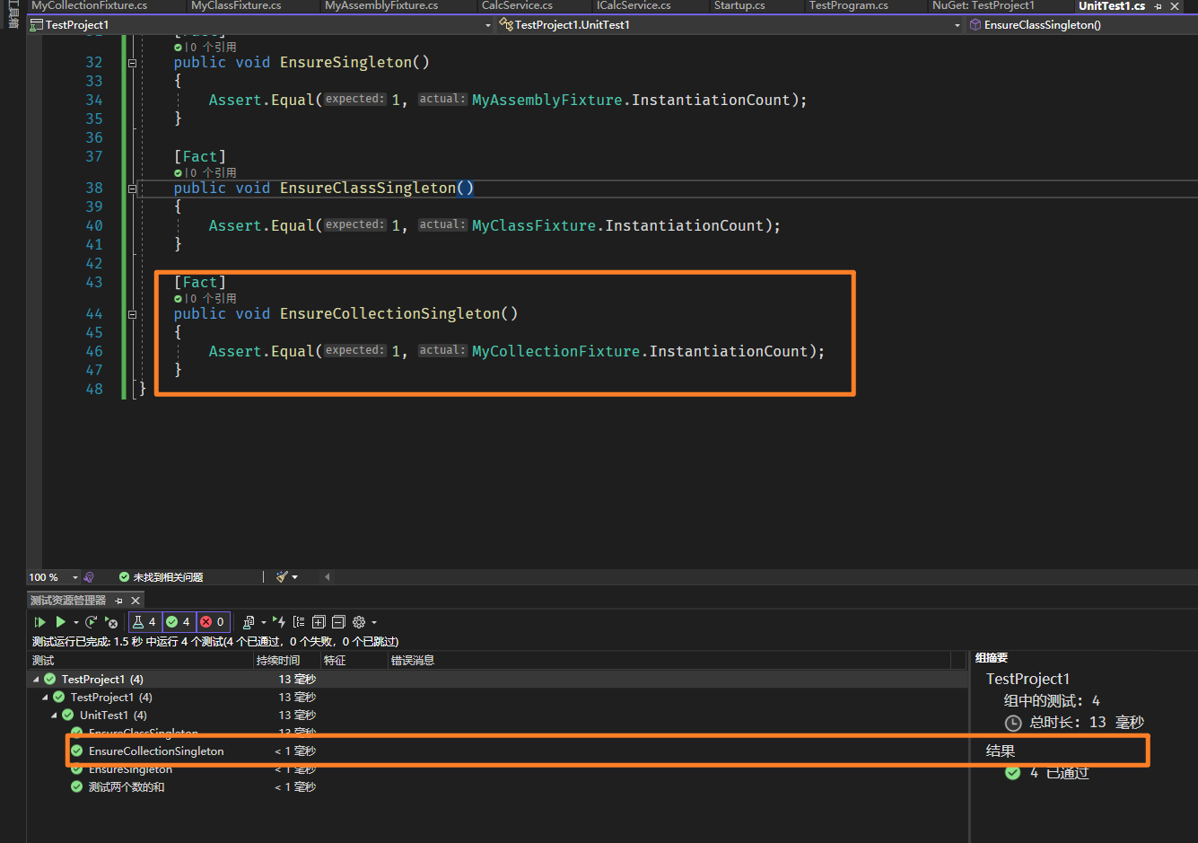 ICollectionFixture<> 方式和 IClassFixture<> 方式最大的不同就是后者只能配置为单个测试类使用,而 ICollectionFixture<> 则通过 [Collection] 方式配置多个测试类有效,如: