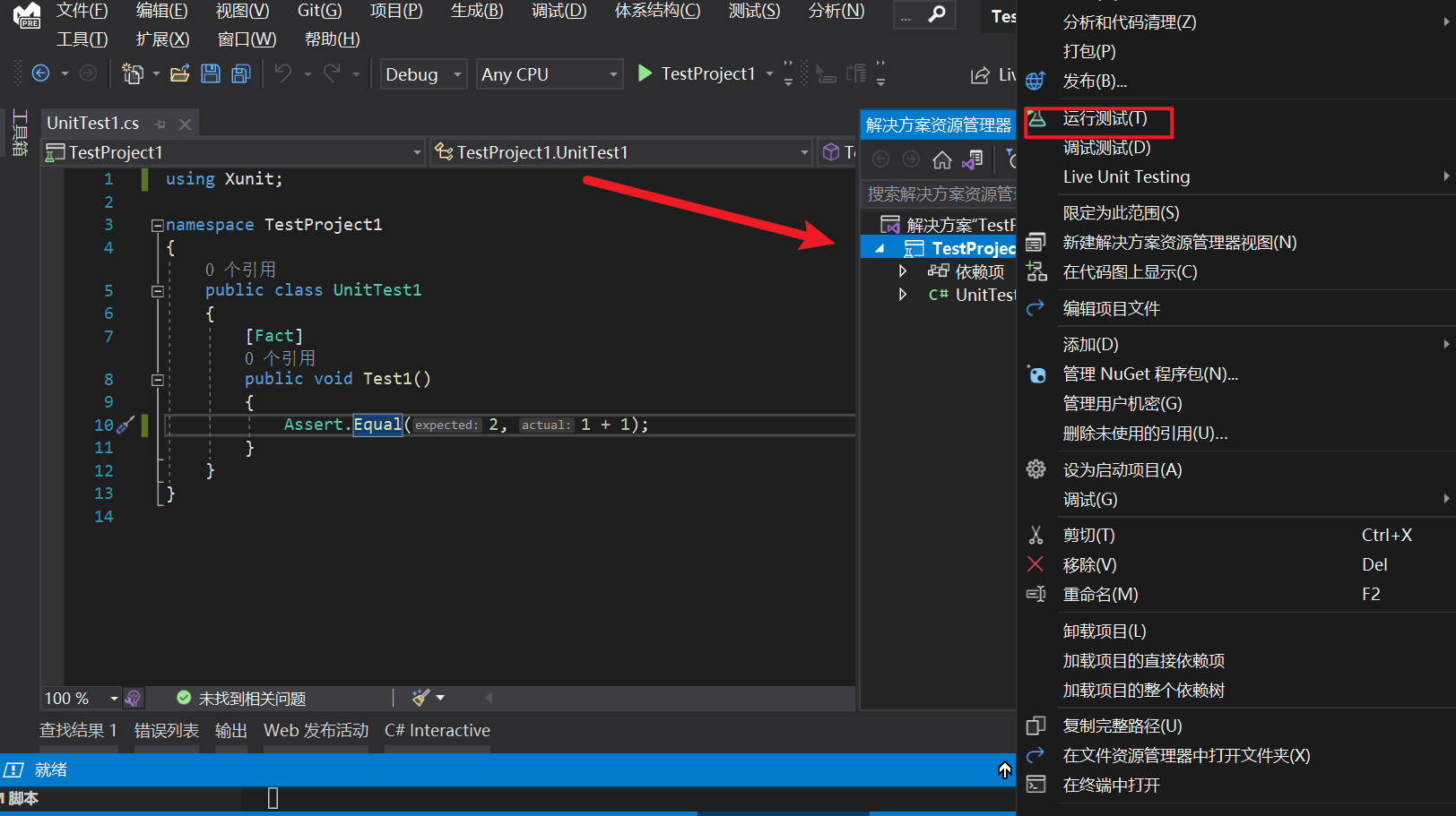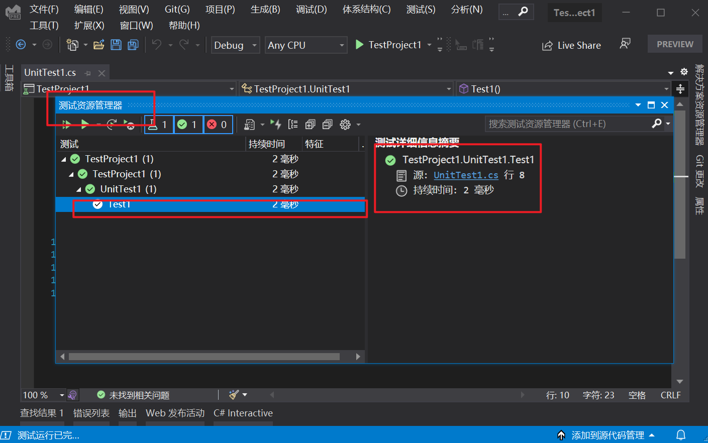 在单元测试项目中 右键 选择 运行测试 并打开 测试资源管理器 即可查看测试结果。
