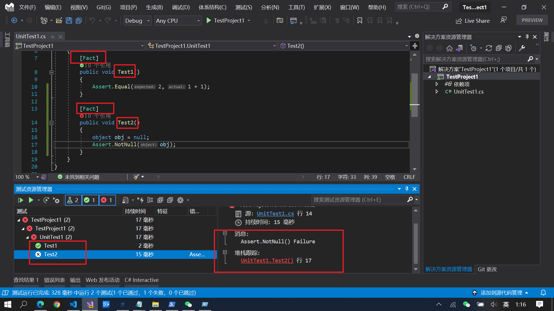 单元测试实际上是通过普通的类的方法进行模块功能测试,具体测试则是标记了 [Fact] 特性的方法,在方法中使用 Assert 类提供的静态方法进行 断言断言 成功,则测试通过,否则测试不通过。