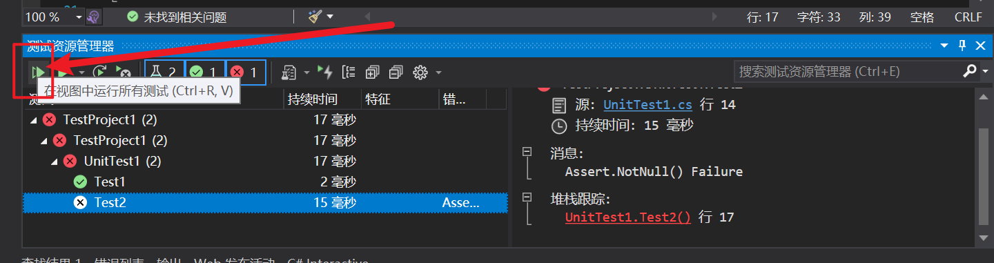 后续添加更多测试方法只需在 测试资源管理器 点击 在视图中运行所有测试 播放按钮即可,如下图