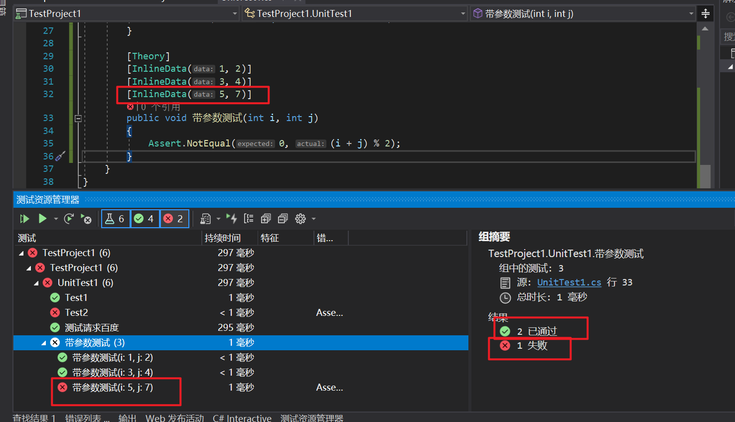上面例子中,测试方法都是没有参数的,有时候需要同一个方法输入多个不同的值进行测试,这时候就需要用到 [Theory][InlineData] 特性了。