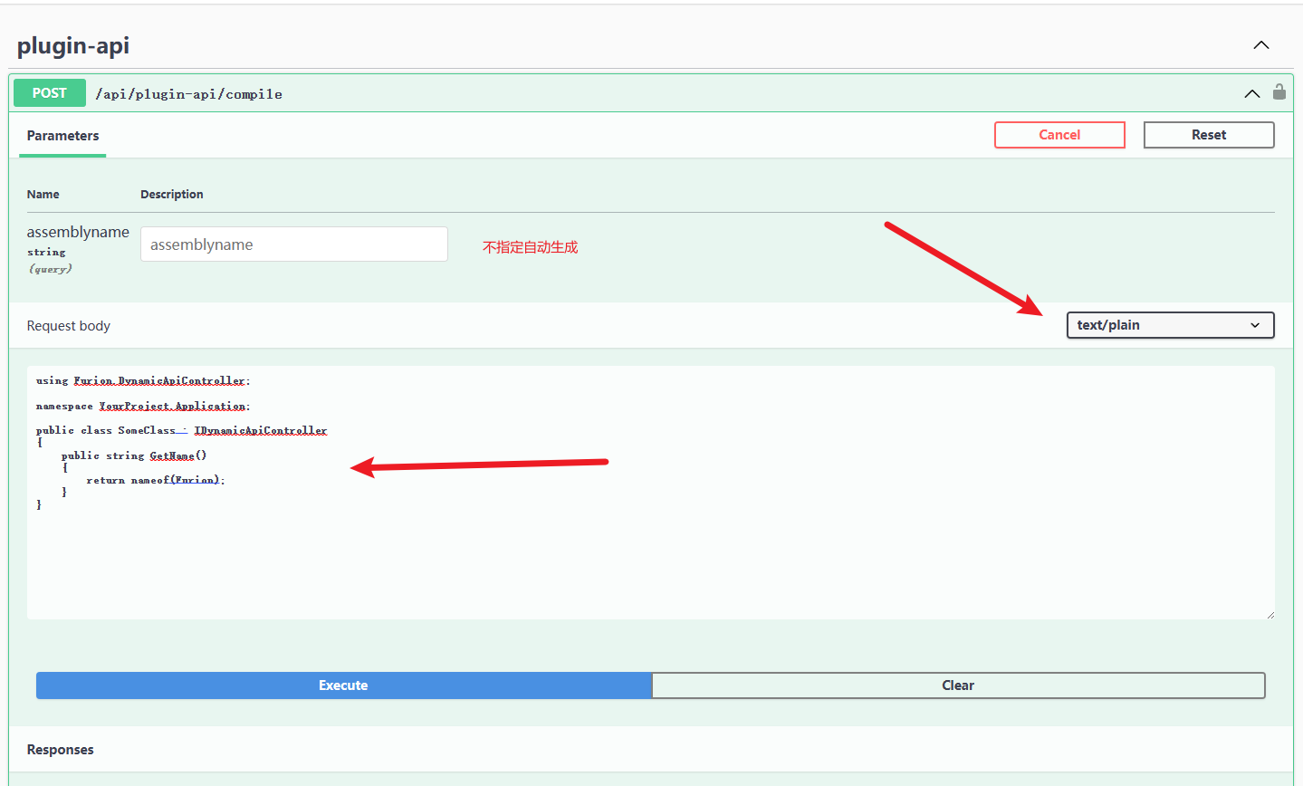 这时只需要请求 api/plugin-api/compile 接口同时设置请求 Content-Typetext/plain,接下来传入 C# 代码字符串 即可,如: