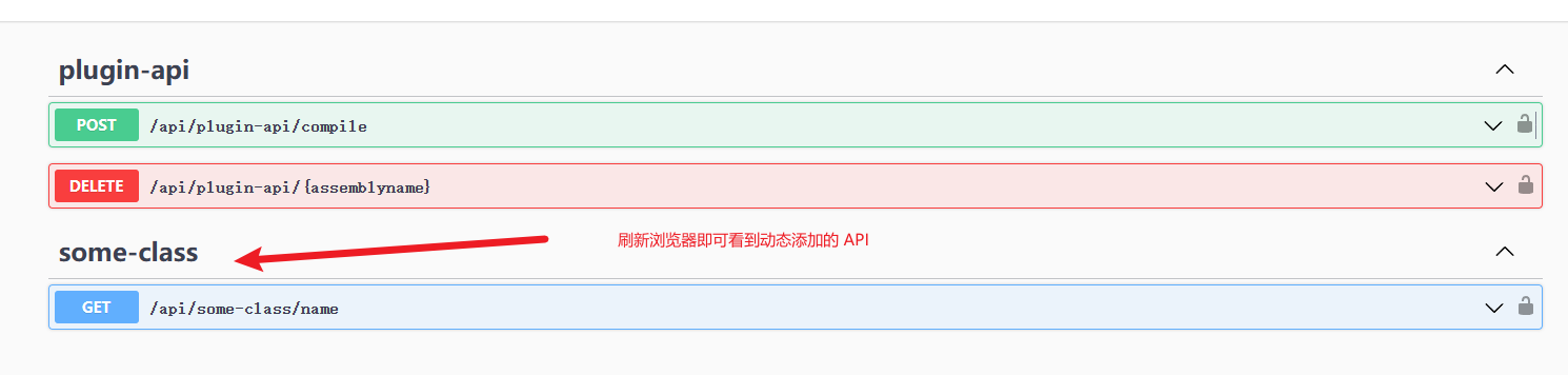 在一些特定的需求中,我们需要在运行时动态编译代码,如动态编写 WebAPI,之后能够在不重启主机服务的情况下即可有效。比如这里动态添加 SomeClass 动态 WebAPI,然后在 Swagger/路由系统 中立即有效: